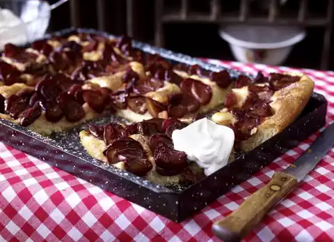 Grease a fat pan (deep baking tray; approx. 32 x 39 cm). Wash the plums, halve them lengthwise and stone them. Knead dough on a little flour and roll out on the fat pan. Spread the plums close together, pressing them lightly into the dough.