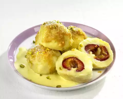 Melt butter in a pan. Roast breadcrumbs in it. Take the dumplings out of the cooking water, let them drain and arrange them on plates. Pour breadcrumbs and butter hot over the dumplings. Chop the pistachio kernels and sprinkle over the dumplings. Dust with icing sugar. Serve with vanilla sauce
