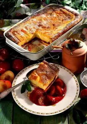 Place the dough in a greased casserole dish (approx. 35 cm) and line the dish completely with the dough. Spread the plum puree on the base. Whisk remaining eggs, egg yolks, cream, 2 tablespoons icing sugar and cognac and pour egg mixture into the mould.