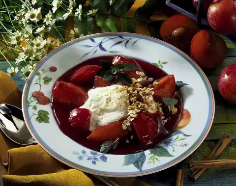Wash, halve and stone the plums. Then cut into slices. Bring the currant juice briefly to the boil. Steam plums for about 5 minutes. Flavour with sweetener. Mix starch with a little water.