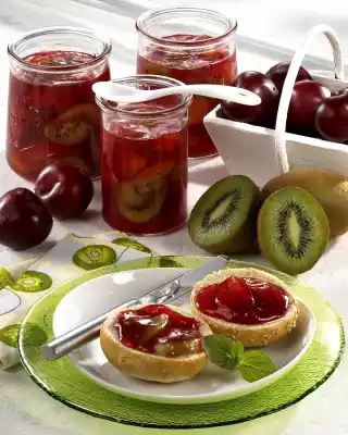 Wash the plums, quarter them and remove the seeds. Weigh 500 g of flesh. Peel kiwis and cut them into fine slices or small pieces. Weigh 200 g of flesh. Mix well the weighed fruit, pear juice and jam sugar in a large saucepan.