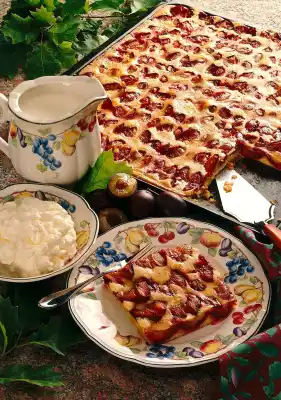 Sprinkle with sugar. Bake in the preheated oven (electric cooker: 175°/ gas: level 2) for approx. 60 minutes. Beat the eggs, sour cream and cinnamon. After 30 minutes, carefully pour the mixture over the cake. Results in about 20 pieces.