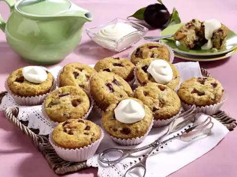 Finally fold in the plums. Line the hollows of a muffin tray (12 hollows) with paper sleeves. Fill in the dough evenly. Bake the muffins in a preheated oven (electric cooker: 175 °C/ convection oven: 150 °C/ gas: level 2) for 20-30 minutes. Remove the muffins from the trays and let them cool on a cake rack. Mix sour cream, lemon juice and vanilla sugar and serve with the muffins