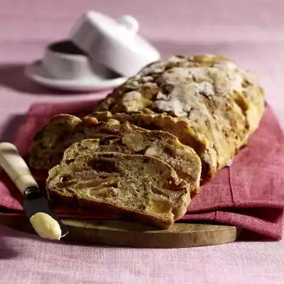 Add cookie spice, fruits, nuts and plums and knead first with the dough hooks, then with floured hands on a floured work surface. Cut the dough in half and form into elongated narrow loaves. Put the breads on a baking tray covered with baking paper and let them rise for 45-60 minutes (the dough should have risen clearly). Bake the breads in a preheated oven (electric cooker: 200 °C/ convection oven: 175 °C/ gas: level 3) for 25-35 minutes. Let the bread cool down on a kitchen grid and cut into 10 slices