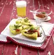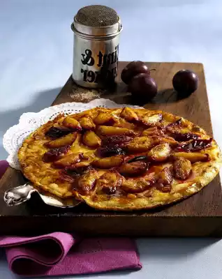 Mix eggs, flour, milk, 1-2 tablespoons of sugar and salt with the whisk of the hand mixer to a smooth dough. Let rest for 30 minutes. Wash, quarter and stone the plums. Mix 2 tablespoons of sugar and cinnamon. Heat 1 teaspoon of clarified butter in a pan.
