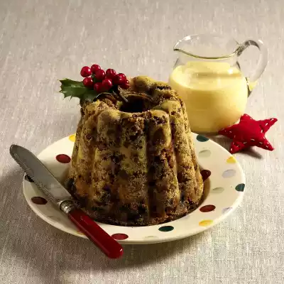 Take the pudding out of the water, let it rest for 10 minutes and turn out of the mould. Let the pudding cool down completely for 2 hours. Mix 5 tablespoons of milk and 25 g sugar with the sauce powder. Bring the rest of the milk to the boil, remove from the heat, stir in the sauce powder and bring to the boil again. Let it cool down. Serve plum pudding with the vanilla sauce