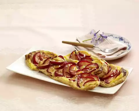Place the puff pastry slices next to each other and defrost. Bring 200 ml milk to the boil. Stir 50 ml milk, sugar and pudding powder until smooth and stir into the milk. Let the pudding simmer for about 1 minute while stirring. Cover the surface with foil and chill. Wash plums, grate dry, halve and stone. Cut halves into thin slices.