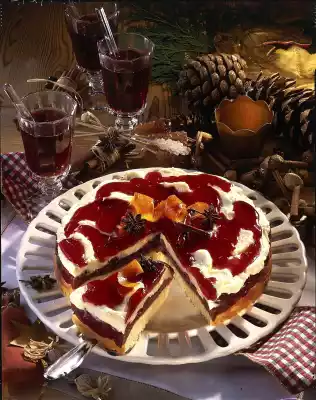 Whip cream and sauce powder until stiff, spread on the punch like a wave. Mix cake glaze and 1 1/2 teaspoon sugar. Mix with 1/8 l prune juice (if necessary, fill up to 1/8 l with water). If necessary add cinnamon, aniseed and piece of lemon peel. Boil up while stirring. Spread the icing with the spices on the cream
