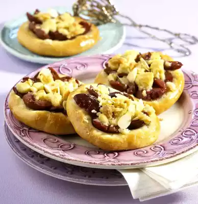 Knead 100 g flour, 80 g sugar, bitter almond oil, almonds and butter to a crumbly dough, chill. Drain plums and let them drain. Knead the dough again, form into a roll and divide into 18 pieces of equal size. Place the dough pieces on 2 baking trays lined with baking paper and form into flat talers. Cover dough talers with plums. Put crumbles on top. Bake the trays one after the other in a preheated oven (electric cooker: 200 °C/ convection oven: 175 °C/ gas: level 3) for 15-20 minutes