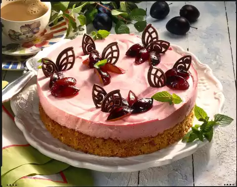 Boil up the rest of the plums with red wine, sugar, citro-back and cinnamon. Simmer at low heat for about 5 minutes. Remove the cinnamon stick. Puree the plums and then pass through a sieve. Gradually stir squeezed gelatine into the still hot plum puree. Place the puree in a cool place until it begins to gel. In the meantime, whip the cream until stiff and fold into the gelling plum puree in portions. Remove the cake base from the tin, place on a cake plate and place a cake ring around it. Spread the cream on the cake base and spread it cloudy. Put the cake in a cool place for about 3 hours. Before serving, loosen the cake ring with a sharp knife. Decorate the cake with the remaining plums, dessert decoration and mint as desired