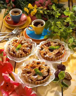 Put flour, fat, nuts, sugar, egg, vanilla sugar and salt into a mixing bowl, knead with the dough hooks of the hand mixer and then work into a smooth dough with your hands. Cover and put in a cool place for approx. 20 minutes. In the meantime, wash and stone the plums thoroughly. Roll out the shortcrust pastry thinly on a floured work surface and cut out circles with a mould. Place circles in greased baking trays (12 cm Ø, with removable base). Prick the pastry base several times with a fork, spread with plum jam and cover with plums.