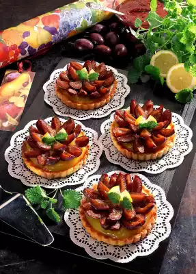 Remove from the moulds and allow to cool. Spread the bottom of the tartlets with plum puree, pour in lemon pudding. Wash, stone and quarter the plums and cover the pudding with them. Sprinkle with remaining sugar and decorate with lemon pieces and lemon balm.