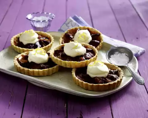 Boil up apple juice to 4 tablespoons, 2 tablespoons sugar and 2 tablespoons lemon juice. Stir pudding powder and 4 tablespoons of juice until smooth, use to thicken the juice. Simmer again for about 1 minute. Add the plums and fold in. Roll out the dough thinly on a lightly floured work surface. Cut out 8 circles (each approx. 14 cm Ø). Place in small greased tartlet cups (approx. 12 cm Ø) with lift-off base. Press on the edges and cut off any protruding edges. Prick the base several times with a fork and cover with plum jelly. Bake in the preheated oven (electric cooker: 200 °C/ convection oven: 175 °C/ gas: level 3) on the lower shelf for 20-30 minutes. Remove the tartlets from the oven, remove from the tin after about 10 minutes and let them cool on a cake rack. Whip the cream, vanilla sugar and sugar with the whisk of the hand mixer until creamy and firm, adding 2 tablespoons of lemon juice.