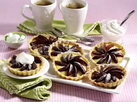 Add the pudding cream and mix with the whisk of the hand mixer. Whip at highest setting for 1 minute. Spread the cream over the tartlets and cover with plum wedges. Bake the tartelettes for another 15-20 minutes at the same temperature. Remove the tartelettes from the oven, take them out of the tin after about 10 minutes and let them cool down on a cake rack. Sprinkle with icing sugar before serving. Whipped cream tastes good with it
