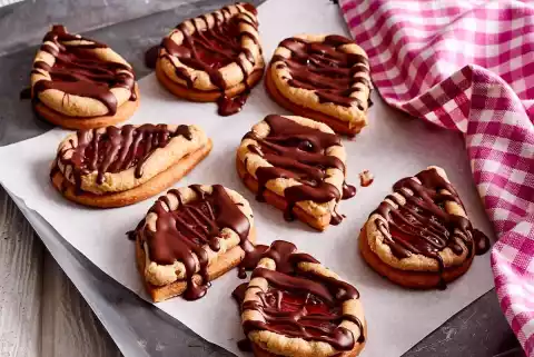 Warm the plum jam in a pot, let it cool down a little and fill the "tears" with it. Let it cool down and get firm. Coarsely chop the chocolate coating and melt it over a warm water bath. Decorate "Tears" thickly with chocolate door strips and let it dry.