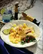 Drain the vegetables. Wash, clean, quarter and seed the tomato. Finely dice the flesh. Drain potatoes and leek. Melt the fat. Swivel vegetables in it. Arrange fish, vegetables, potatoes and sauce on a plate.