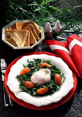 Leave to simmer for 3-4 minutes. Mix dandelion, tomato cake, onion, tarragon and the marinade. Arrange the salad on four plates. Remove the eggs with a skimmer, quench and drain.