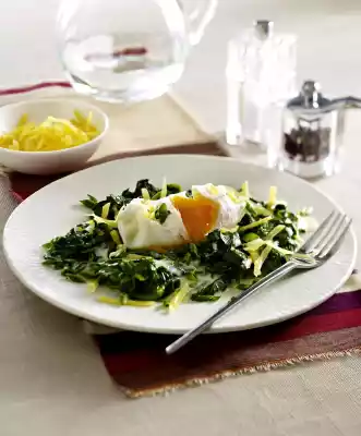 Wash the chives, shake dry and cut into rings. Arrange the spinach on plates, place one egg on each. Sprinkle the rest of the cheese and chives on top