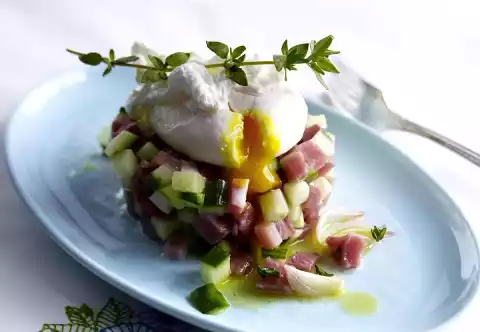 Cook over low heat for about 5 minutes. Spread the vinaigrette over the tartar. Arrange eggs in portions on top and garnish with thyme.