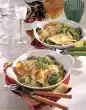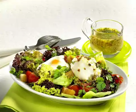 Mix the prepared salad ingredients and marinade and leave to stand. Bring plenty of water to the boil. Add 100 ml vinegar. Beat the eggs one after the other and carefully slide them into the vinegar water. Turn with the help of 2 forks so that the egg whites do not separate. Cook the eggs for about 5 minutes. Serve with the salad in portions. Serve sprinkled with croutons and chervil