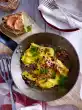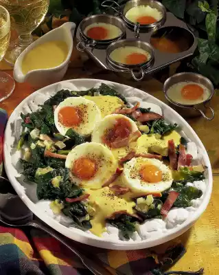 Beat one egg each in a small bowl, put it in the insert, put it in the boiling water and let it cook covered for about 8 minutes. In the meantime peel and finely dice the onions. Heat oil in a pan, fry onions until translucent, add ham and spinach and let them stew for about 8 minutes. Season spinach with salt, pepper and nutmeg. For the sauce, melt butter over medium heat and then bring to the boil briefly. Set aside and let it cool down a little. In the meantime, whisk the egg yolk and wine vigorously on a hot water bath with a whisk (must be frothy). Add butter drop by drop while stirring constantly and then season to taste with lemon juice, mustard, salt and pepper. Remove the eggs from the bowls and season with salt and pepper.