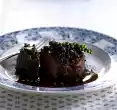 Quarter the potatoes. For the sauce, peel and finely dice the onions. Put the rest of the red wine, port and onion in a pot, bring to the boil and let it boil down for about 10 minutes. Add veal stock, bring to the boil, stir in butter, puree the sauce and season with salt and pepper.