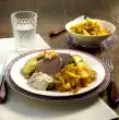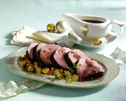 Fry the vegetables for 10-12 minutes. Season with salt, pepper and marjoram. Remove meat from the oven. Heat 10 g butter in a pan and fry the meat briefly all around. Cut the meat open and arrange on a plate with the vegetables.