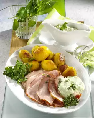 Finely chop the egg whites of 3 eggs and stir into the egg yolk mixture. (Use the rest of the egg white for other purposes.) Stir in the quark. Wash the herbs and drain well. Cut chives into fine rolls. Chop the remaining herbs finely and stir into the sauce. Season to taste with salt, pepper and sugar. Put in a cool place. Heat 25 ml oil in a frying pan, add potatoes and fry until golden brown while turning. Season with salt and pepper. In the meantime, lift the smoked pork loin out of the stock and slice thinly. Serve the potatoes, smoked pork loin and some sauce on a plate, garnished with herbs as desired. Res