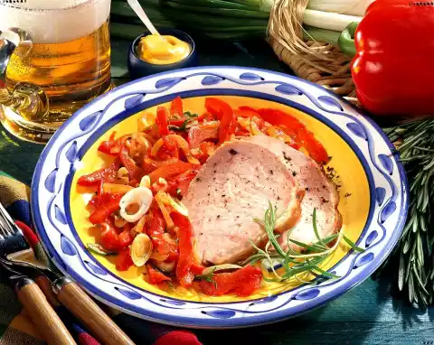 Wash cured pork. Add bay leaf and peppercorns to plenty of water and bring to the boil. Let simmer at low heat for 35-40 minutes. In the meantime peel onions and cut them into half rings. Clean, wash and cut the peppers into strips. Wash the rosemary, dab dry and, except for a little garnish, pluck the leaves from the stalk. Heat the oil.