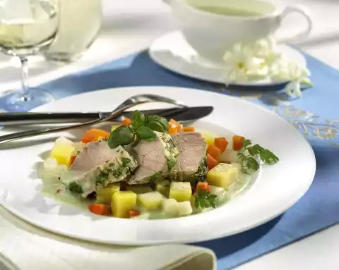 Season to taste with salt. Drain vegetables. Remove meat from the stock, turn in the remaining herbs and cut into slices. Arrange vegetables, meat and sauce. Garnish with herbs.