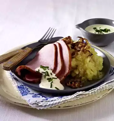 Heat 100 ml milk and 30 g butter. Drain potato and pear mixture, add hot milk and mash everything coarsely. Season puree with salt and pepper. Put onion rings in a bowl, dust with flour and toss. Heat 20 g butter in a frying pan, fry the onion rings until crispy brown, turning them over. Remove the smoked pork from the stock, drain and cut into thin slices. Arrange the smoked pork together with the pear and mashed potatoes on plates. Spread roasted onions on the puree and put some horseradish cream on the slices of Kasseler. Sprinkle with chives. Add the rest of the sour cream