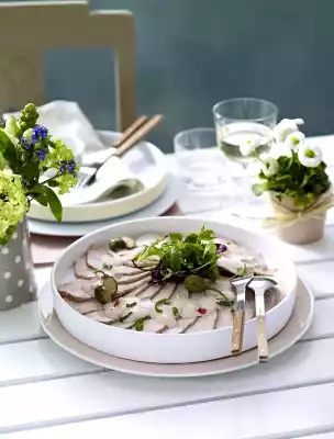 Cut the turkey breast into slices as thin as possible. Arrange the turkey in a fan shape. Drizzle with tonnato sauce. Sprinkle with basil and garnish with caper apples and lettuce. Add the rest of the sauce