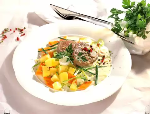Bring the meat stock, peppercorns and spring onion rings briefly to the boil. Steam veal fillets in it for about 5 minutes. Wash the chives and cut into small rolls. Drain the vegetables, refine the stock with cream, sprinkle with sauce thickener, bring to the boil briefly.