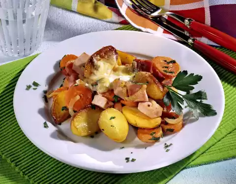 Wash and peel the carrots and potatoes. Halve the potatoes and cut the carrots into slices. Peel onions and cut into half rings. Cut ham into thick cubes. Heat oil in a frying pan and fry the potatoes for 8-10 minutes, turning.