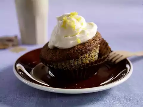 Cream 125 grams of softened butter, 125 grams of sugar and vanillin sugar. Stir in the eggs one by one. Mix flour and baking powder. Alternate with the poppy seed mixture and stir in briefly. Place two paper sleeves in each of the cavities of a muffin tin (twelve cavities) and spread the dough in them. Bake in the preheated oven (electric cooker: 175 °C/ convection oven: 150 °C/ gas: level 2) for 20 to 25 minutes. Let the muffins cool down. Whip cream cheese, icing sugar and six tablespoons of lemon juice. Spread over the muffins.