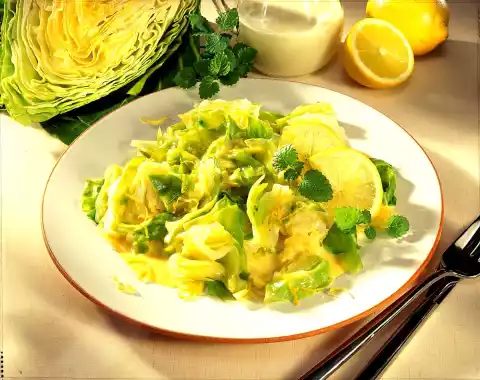 Mix cream, sauce thickener, lemon juice and zest. Pour into the pointed cabbage, cover and simmer for another 5 minutes while stirring. Season pointed cabbage with salt, pepper and lemon juice and arrange on plates. Serve garnished with lemon balm, lemon slices and julienne