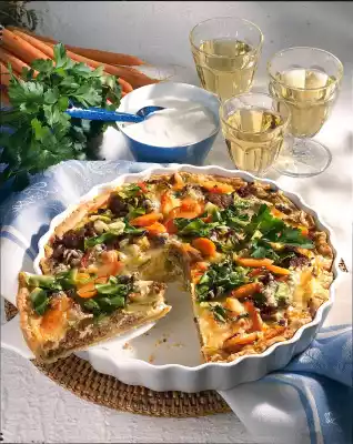 Season with salt and pepper. Clean and wash the pointed cabbage and cut into strips. Peel, wash and slice the carrots. Remove the minced meat from the pan and set aside. Steam the pointed cabbage and carrots in cooking fat for 8-10 minutes over medium heat, turning occasionally. Season with salt, pepper and nutmeg. Roll out short pastry on a lightly floured work surface (approx. 36 cm Ø). Grease a quiche tin (approx. 26 cm Ø) and line with the pastry. Sprinkle with breadcrumbs. Spread the chopped and pointed cabbage-carrot-vegetables on the dough. Mix the sour cream and remaining eggs and season with salt, pepper and nutmeg. Pour over the quiche and bake in the preheated oven (electric: 200 °C/ gas: level 3) for 50-60 minutes.