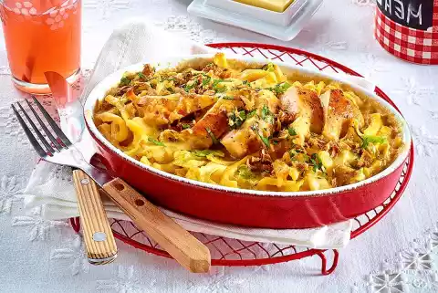 Remove the fillets from the pan. Melt the butter in the frying fat. Fry cabbage in it for about 5 minutes. Fry the spaetzle for about 3 minutes. Season with salt and pepper. 1⁄4 l Stir in water, cream and stock. Bring to the boil, stir in sauce thickener and simmer for 1-2 minutes. Season to taste with salt, pepper and nutmeg.