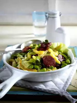 Heat the oil in a large frying pan. Fry the Kabanossi in it while turning. Fry the spaetzle briefly. Take out both. Fry cabbage and beans in hot frying fat for about 5 minutes, turning them over. Season with salt and pepper.