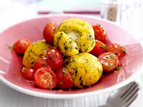 Wash the tomatoes, grate them dry and cut them in half. Peel and chop the garlic. Heat 2-3 tablespoons of oil in a frying pan. Fry the tomatoes for 5-6 minutes. Add garlic after about 2 minutes. Season tomatoes with salt and pepper and add parsley. Arrange tomatoes and polenta balls on plates and serve