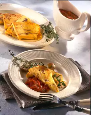 Heat the remaining oil in a coated pan and fry the polenta slices in it until golden brown. Arrange the polenta mushroom cake with the marinated mushrooms and tomato sauce on plates. Garnish with the remaining thyme stems.