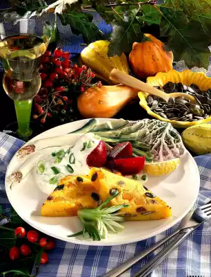 Sprinkle polenta in 1/2 litre of boiling salted water and let it swell for 10 minutes at low heat. Drain the pumpkin and stir into the polenta with coarsely chopped pumpkin seeds. Spread polenta on 1/3 of a greased baking tray and let it cool down. In the meantime wash beetroot and cook in boiling salted water for about 30 minutes.