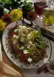 Clean and wash spring onions, cut into rings and stir into the sour cream. Cut polenta into rhombs and fry in hot fat until golden brown. Arrange polenta, beetroot and sour cream on a plate. Garnish with spring onion blossom if desired