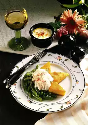 Bring 1 litre water, 25 g fat and 1/2 teaspoon salt to the boil. Sprinkle in corn semolina and let it swell briefly. Put it into a greased flat dish, smooth it down and let it cool down. Clean, wash and cut the beans into pieces. Peel onion and garlic and chop finely. Heat 20 g fat and fry both in it. Add the beans and fry briefly. Add some water and cook covered at medium heat for 15-20 minutes. Season with salt and pepper. Put yoghurt and feta cheese in a bowl and puree with the cutting stick of the hand mixer. Stir in olive oil and season to taste with pepper. Turn out the corn semolina from the mould and cut into rhombuses. Heat the remaining fat in a pan and fry the rhombs in it until golden brown. Arrange the rhombs, bean vegetables and sheep's cheese dip on plates. Dust with paprika