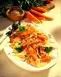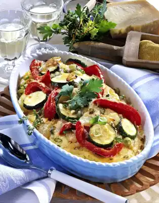 Cook over a low to medium heat while stirring to a thick mash. Put it into a greased, ovenproof dish. Clean and wash the peppers, zucchini and spring onion. Cut the bell pepper and zucchini roughly into pieces. Cut spring onion into fine rings. Clean and roughly dice the vegetable onion. Heat 20 g fat in a frying pan and fry the vegetables, except for the spring onions. Season with salt and pepper and spread on the polenta. Mix parmesan and spring onions and sprinkle over the vegetables. Spread the remaining fat in flakes on top.