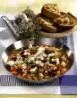 Clean and roughly dice the vegetable onion. Heat 20 g fat in a frying pan and fry the vegetables, except for the spring onions. Season with salt and pepper and spread on the polenta. Mix parmesan and spring onions and sprinkle over the vegetables. Spread the remaining fat in flakes on top. Bake in the preheated oven (electric cooker: 200 °C/ gas: level 3) for about 20 minutes. Serve garnished with parsley and thyme