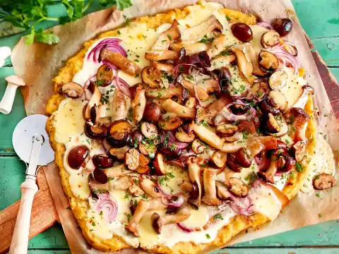 Preheat oven (electric cooker: 200 °C/circulating air: 180 °C/gas: see manufacturer). Peel onions and cut into thin rings. Spread polenta with sour cream. Spread onions and mushrooms on top. Cover with cheese. Bake in a hot oven for 15-20 minutes.