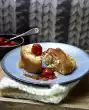 For the garlic dip, peel the garlic, chop roughly and sprinkle with salt. Crush finely with a fork and stir into the mayonnaise. Season with pepper. For the ajvardip, mix crème fraîche and ajvar loosely.