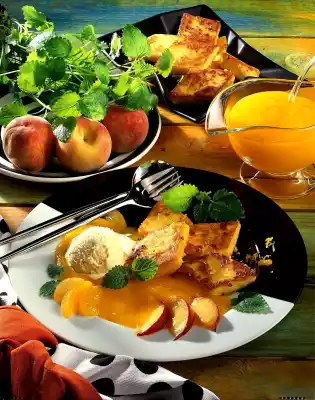 Puree the remaining apricots in the juice. Whisk the sauce powder in 50 ml cold water. Bring the apricot puree to the boil, stir in the sauce powder and bring to the boil again. Cut remaining apricots into slices. Wash and quarter the peaches, remove stones and cut the fruit into slices. Cut polenta into rhombs. Heat oil in a coated pan and fry the polenta in it for about 2 minutes on each side. Take the polenta out of the pan. Melt the remaining fat in the pan and add the lemon peel. Turn the polar tartaroute briefly in the pan.