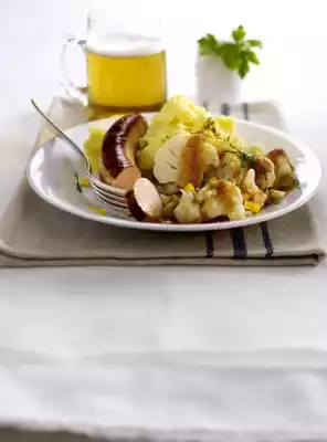 Peel, wash and cut the potatoes into pieces. Cook in boiling salted water for about 20 minutes. Clean the cauliflower, cut out the hard stalk so that the head does not fall apart. Wash the cabbage. In a large pot, boil plenty of salted water with 75 ml milk and lemon juice. Add the cauliflower (cabbage must be covered with water), if necessary weight down with a skimmer and cook for 15-17 minutes.